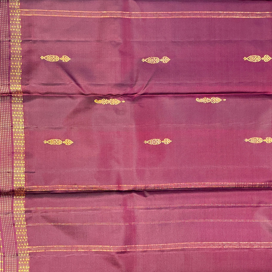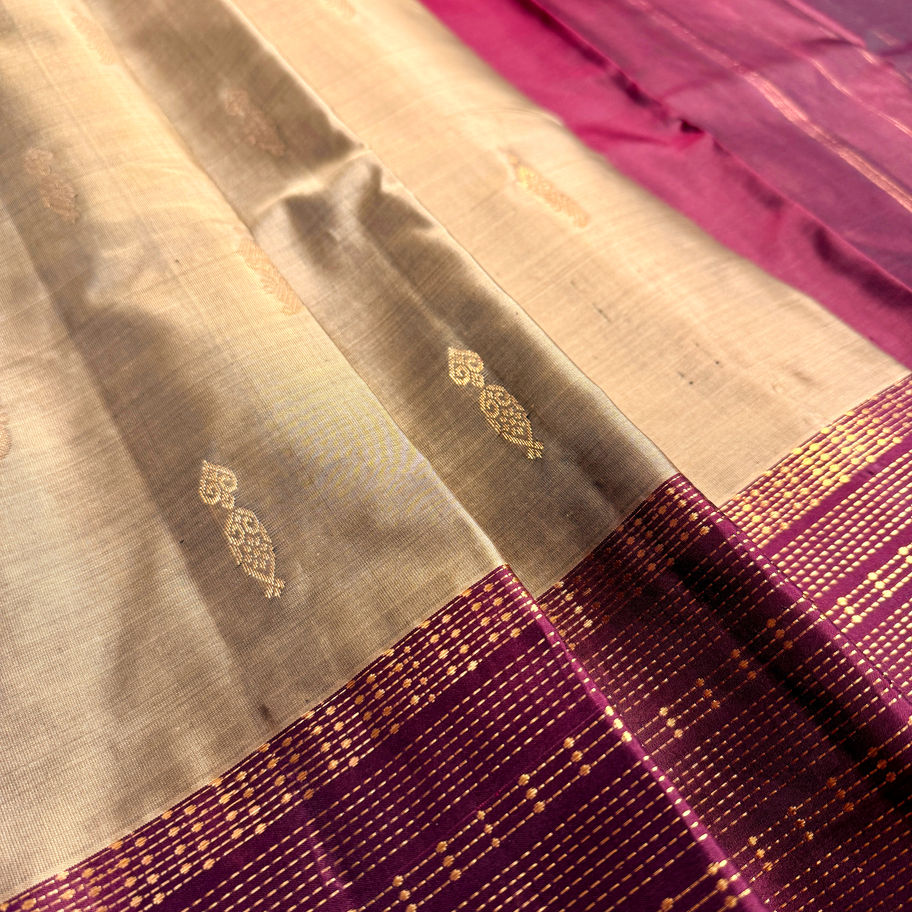 Crafted from premium silk, this masterpiece features a graceful beige body adorned with delicate golden zari motifs, exuding understated luxury. The contrasting magenta border and pallu, intricately woven with shimmering gold zari patterns, add a regal charm to its traditional appeal.