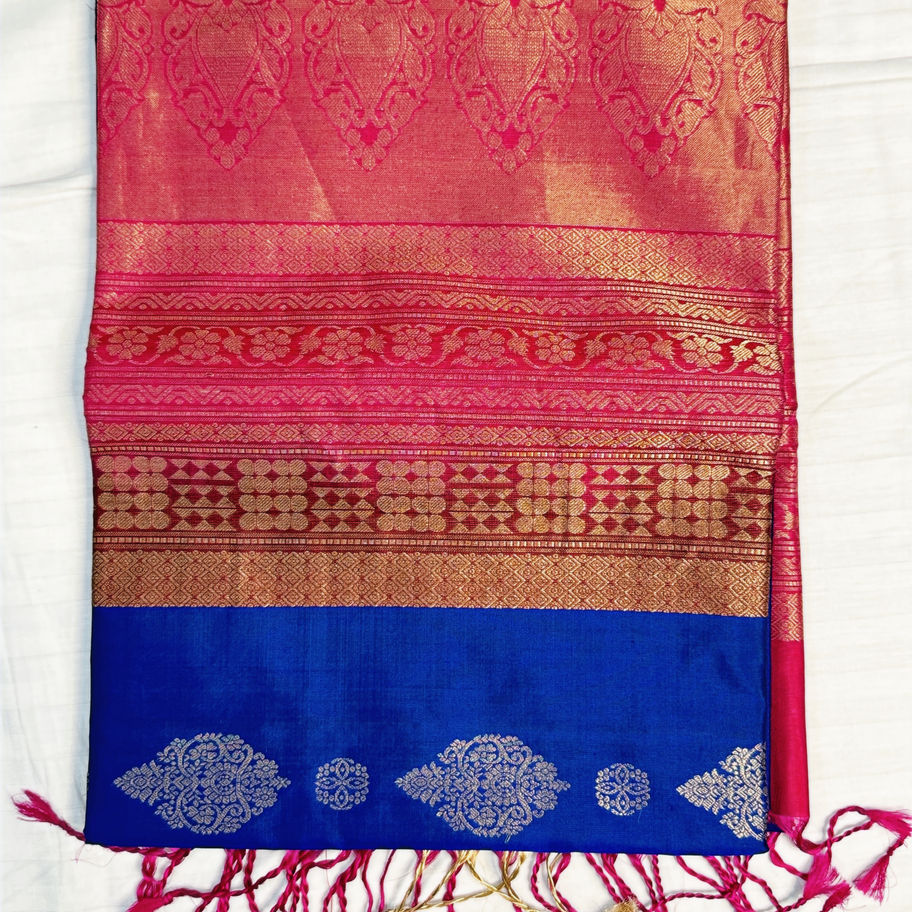 Color: Royal Blue Body with Pink zari-woven Pallu and Border